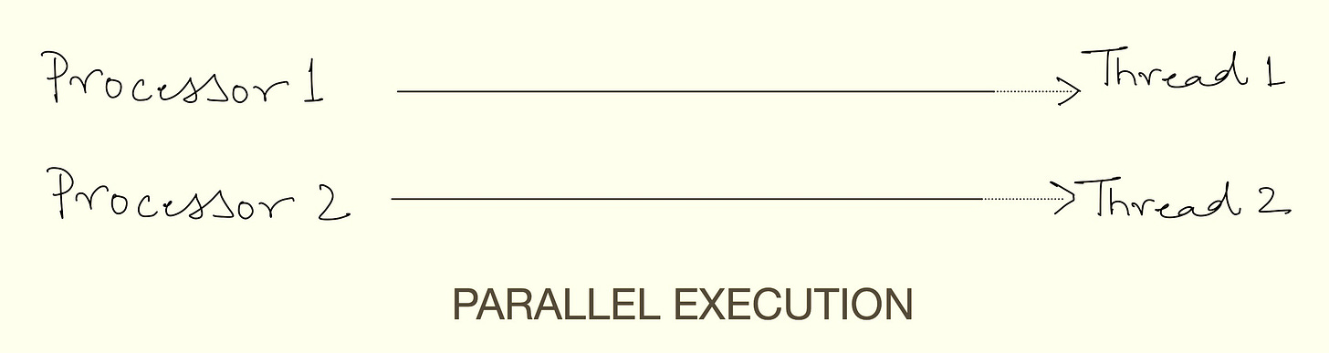 Parallel computing refers to the concept of executing two or more tasks or processes at the same time. On any general computing system, there are multiple different tasks running at the same time. For example, a browser running a video, a word processor for editing a document, the operating system, and so on. These tasks can be divided into separate and independent instruction streams known as “threads” which can be executed simultaneously. There are two ways of executing multiple threads, i.e., concurrency and parallelism. Parallel execution refers to executing multiple threads at the same time using multiple execution pipelines and concurrency refers to a single execution pipeline running multiple threads by switching between them without necessarily completing each one. A program can have either parallelism, concurrency, or a combination of the two. Individual physical execution pipelines on a processor are known as “cores”.
