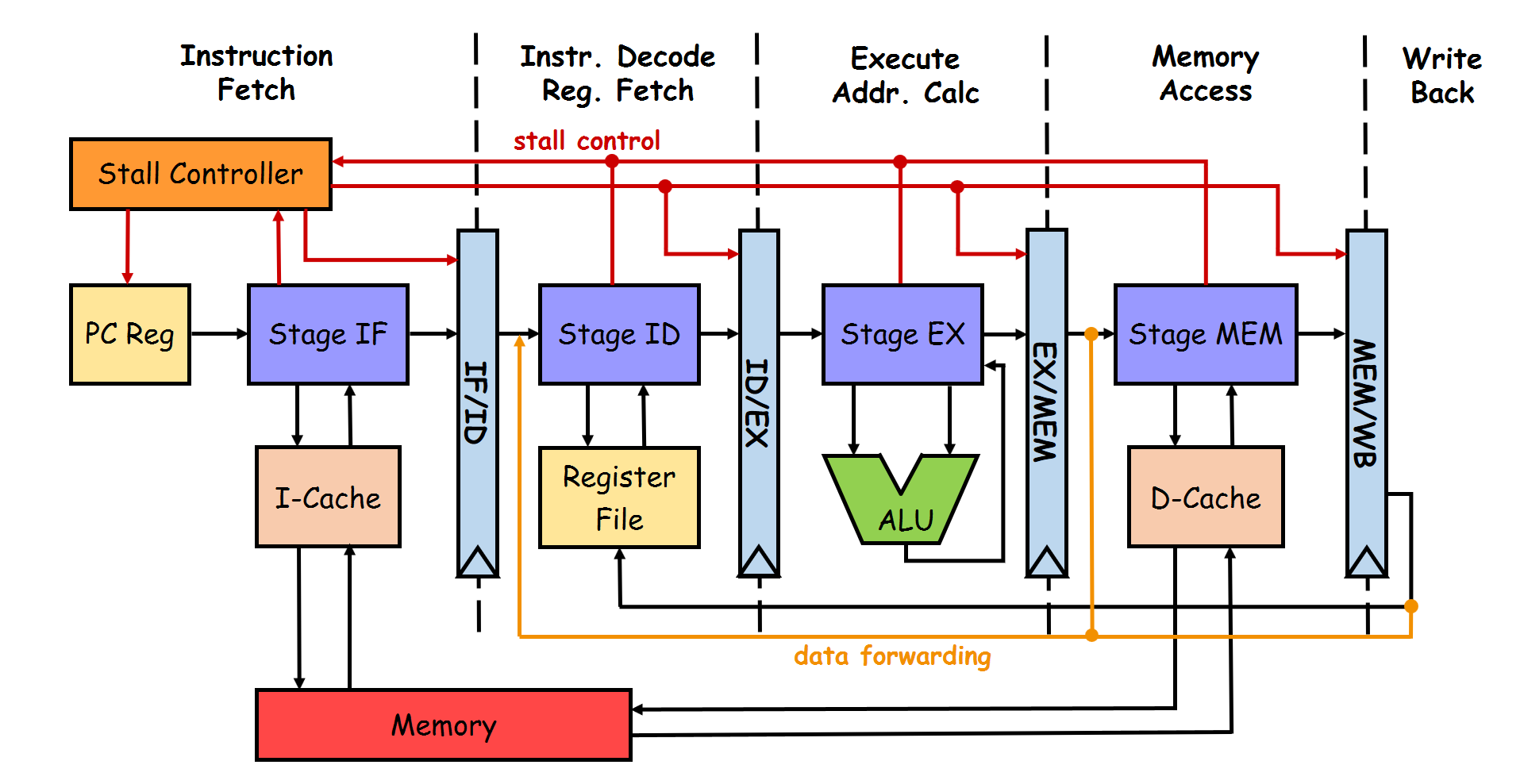 The above image shows the schematic diagram of a 5-stage RISC pipeline. Let’s unwrap each component: