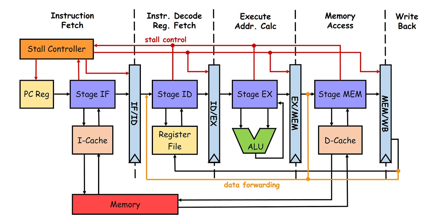 The 5 Stage RISC Pipeline is the most fundamental model for creating an execution flow for a processor. One of the most important features of the execution flow is right there in the name— “pipeline”. The term pipeline is used because just like how a real-world pipeline allows water to flow continuously rather than one drop at a time, the execution pipeline overlaps different instructions moving at the same time, allowing simultaneous execution and making it much faster and more efficient (the alternative is waiting for an instruction to finish execution entirely before starting the next one, significantly reducing throughput).