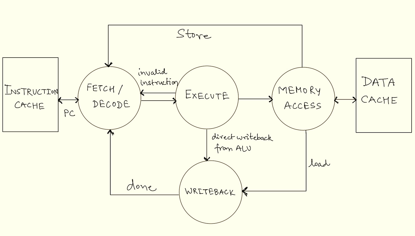 We’ve now covered all components of the 5-Stage RISC pipeline from our diagram and how these components come to work together to create the execution flow that computes the programs we write. The entire execution pipeline (and to some extent, the entire processor) can be visualised as a giant “finite-state machine”. A state machine is a mathematical abstraction used to design systems consisting of a finite number of states, that read a set of inputs and transition to a different state based on those inputs. Each stage of the pipeline—fetch, decode, execute, memory, and writeback—can be thought of as a distinct state, with transitions occurring as instructions move through the pipeline. The diagram below shows the FSM for the execution flow discussed, illustrating how the processor transitions between states to process instructions efficiently.