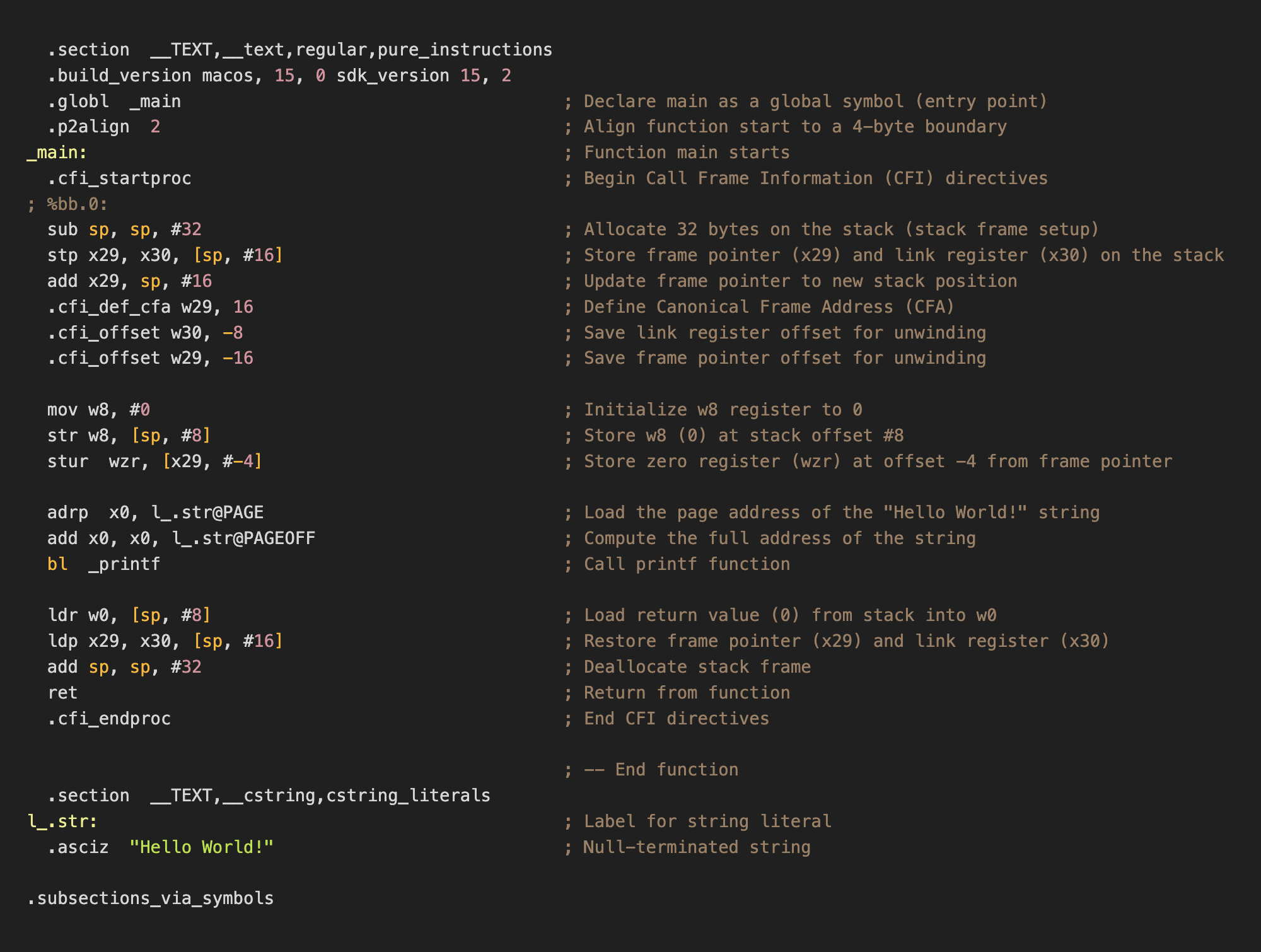 ARM64 Assembly translation of the ‘Hello World’ C program.1